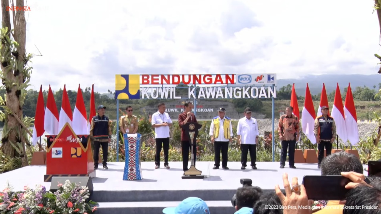 Presiden menyampaikan, Bendungan Kowil Kawangkoan dibangun sejak 2016 dengan anggaran Rp 1,9 triliun, dan memiliki kapasitas tampung 26 juta meter kubik dengan luas genangan 157 hektar.