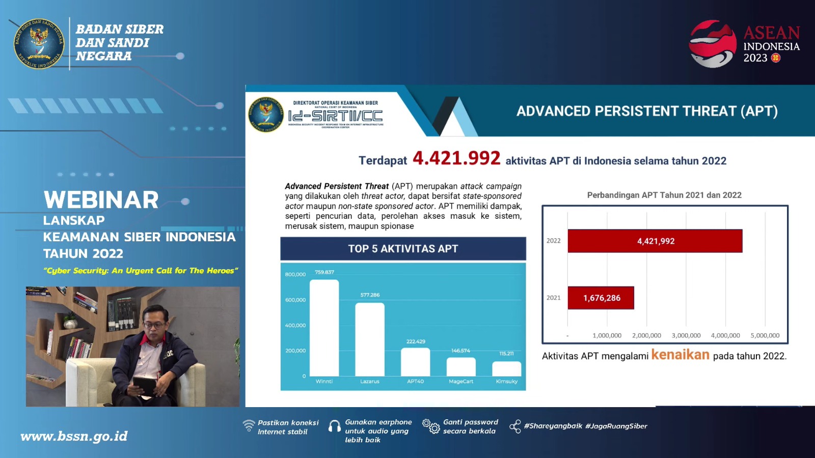 Lebih lanjut, Taufik juga menjelaskan bahwa pada tahun 2022 ada lebih dari 4 juta aktifitas APT (Advanced Persistent Threat) yang berhasil BSSN deteksi dan keluarkan dari aset-aset yang ada di Indonesia.
