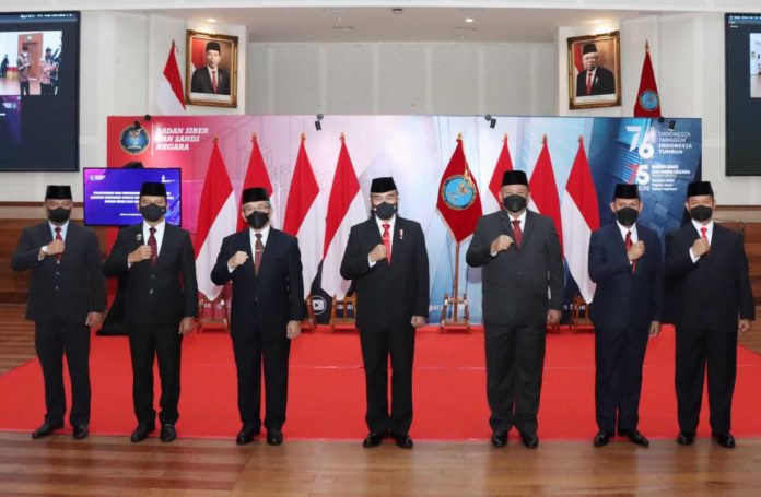 Kepala Badan Siber dan Sandi Negara (BSSN) Letjen TNI (Purn.) Hinsa Siburian melantik dan mengambil sumpah jabatan Wakil Kepala (Waka) BSSN, Deputi Bidang Operasi Keamanan Siber dan Sandi BSSN, serta Deputi Bidang Keamanan Siber dan Sandi Perekonomian BSSN di Auditorium BSSN Bojongsari, Kota Depok, pada Jumat (25/2/2022).