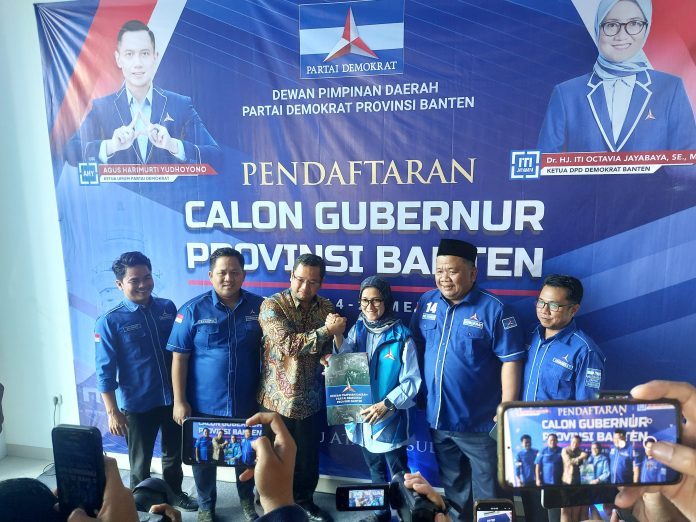 SERANG – Bakal Calon (Bacalon) Gubernur Banten, Arief Wismansyah mengikuti penjaringan Bacalon Gubernur Banten dari Partai Demokrat Banten, Selasa (21/5).