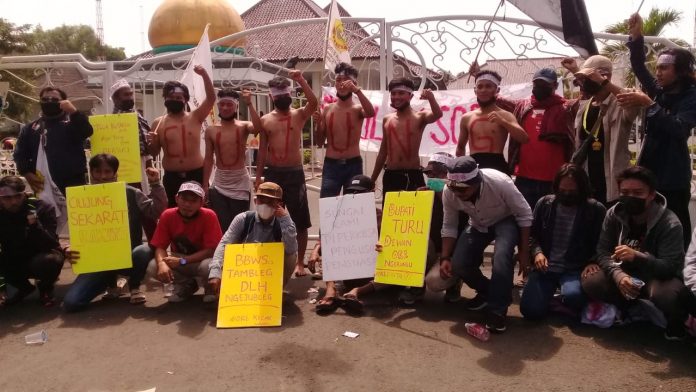 Masyarakat yang tergabung dalam Komunitas Masyarakat Bantaran Sungai (KOMBATS), Forum Kebangkitan Petani Dan Nelayan (FKPN), dan beberapa organisasi lainnya bersama Gerakan Mahasiswa Serang Utara (GAMSUT) menggelar aksi menolak proyek sodetan Sungai Ciujung di depan Pendopo Bupati Serang, pada Kamis siang (17/6).