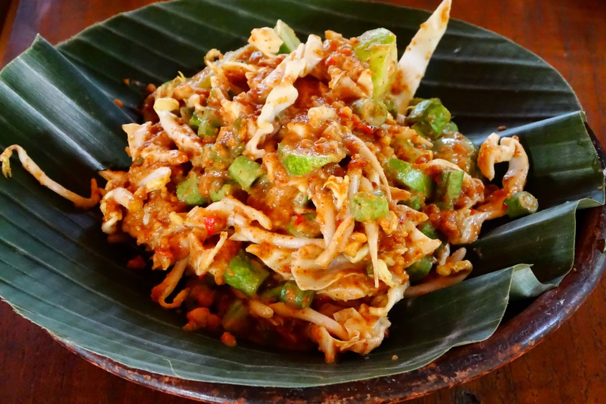 - Siram sayuran dengan bumbu kacang dan aduk rata.