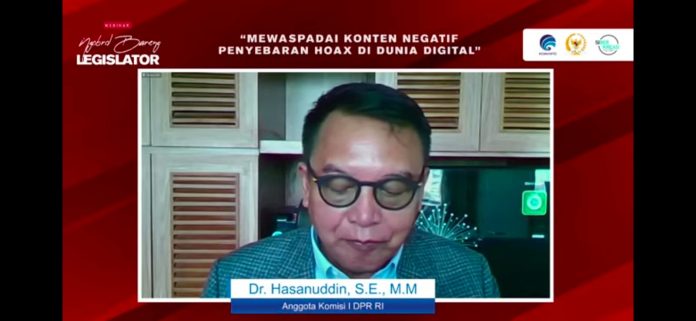Anggota Komisi I DPR RI, TB Hasanuddin ingatkan para pengguna internet di Indonesia agar bijak dan mampu memanfaatkan sisi positif dari transformasi digital. Hal tersebut disampaikan Hasanuddin saat menjadi keynote speaker dalam Webinar Ngobrol Bareng Lesgislator bertajuk “Mewaspadai Konten Negatif Penyebaran Hoax di Dunia Digital”, Kamis siang (30/9/2021).