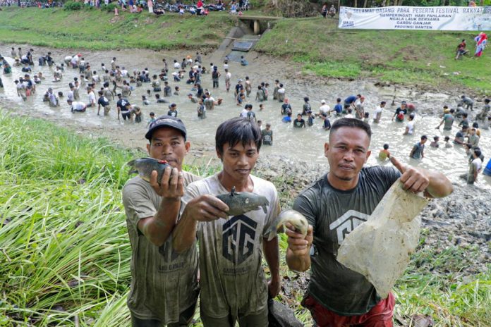 TANGERANG – Ribuan warga desa yang tergabung dalam jaringan relawan Gerakan Rakyat Desa Untuk (Gardu) Ganjar Provinsi Banten memilih cara unik untuk sosialisasi figur Ganjar Pranowo kepada masyarakat. Para relawan menggelar festival bertajuk Ngala Lauk atau lomba menangkap ikan pada Minggu (13/11/2022).